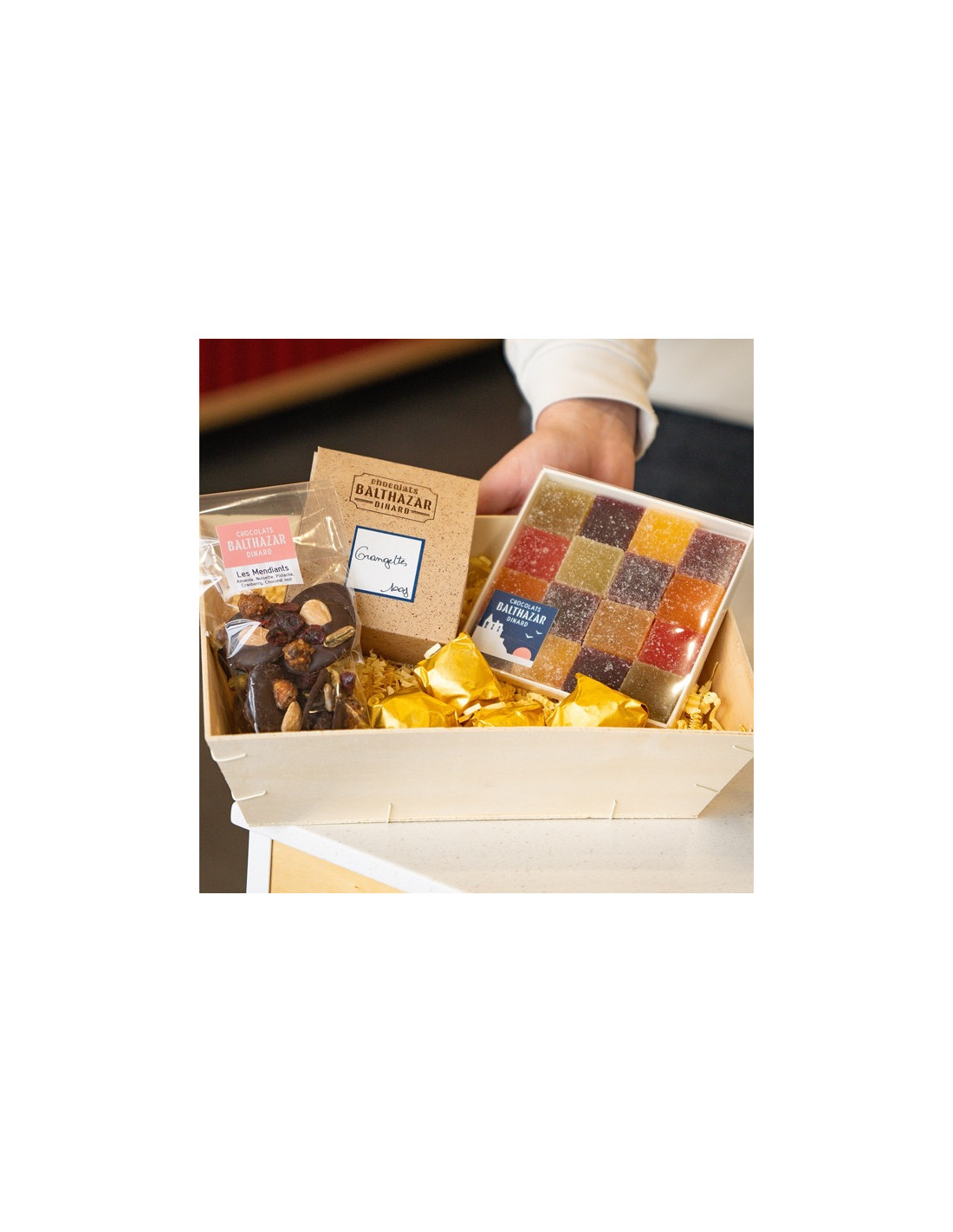 Dans ce coffret, retrouvez de tendres marrons glacés, nos orangettes confites enrobées de chocolat, un coffret de pâtes de fruits aux saveurs naturelles, et un sachet de mendiants croquants et généreux.