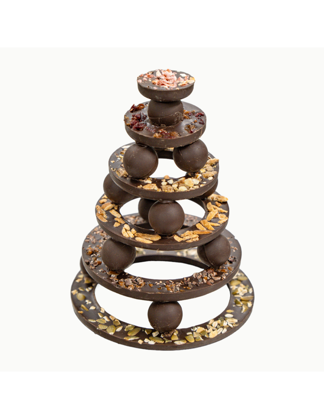 Découvrez notre sapin mendiant, tout en hauteur et en finesse, composé de chocolats fins et de fruits secs croquants. Une création élégante et délicieuse, parfaite pour la fête.